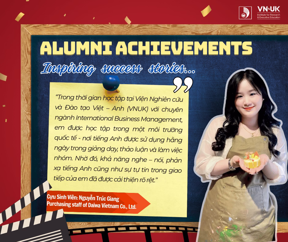 VNUK xin gửi lời cảm ơn đến Nguyễn Trúc Giang, cựu sinh viên ngành International Business Management, vì đã tin tưởng và đồng hành cùng VNUK trong suốt quá trình học tập. VNUK tự hào khi được góp phần tạo nền tảng giúp Giang tự tin bước vào môi trường làm việc chuyên nghiệp và chúc Giang tiếp tục gặt hái nhiều thành công trong sự nghiệp tương lai.